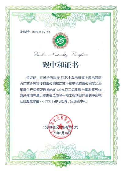 近日,江苏金风科技有限公司、江苏中车电机有限公司,联合北京鉴衡认证中心按照国际标准ISO14064-1:2018对江苏金风科技-江苏中车电机海上风电综合园区(以下简称:园区)2020年的温室气体排放进行核查。核查报告显示,2020年该园区内制造工厂、实验中心、培训中心等生产运营范围内所产生的二氧化碳当量温室气体,通过综合性微网系统中分布式风光储设备的能源替代、节能减排等措施以及注销碳减排指标的方式,实现100%碳中和。