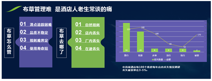 这是卓惠统计100个客房每年丢失的品类数,我没有统计小方巾,小方巾数量会更多。这只是一个区域统计的,但是也具备一定的代表性,整个酒店行业的丢失破损率维持在千分之3-5左右。