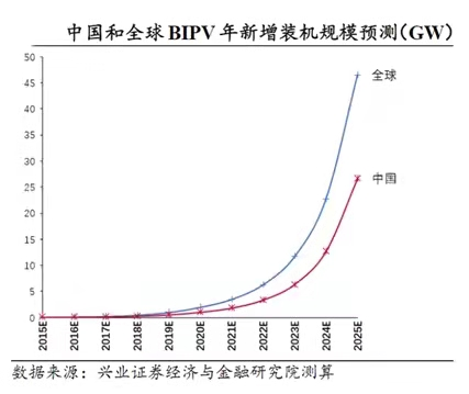 兴业证券测算,我国既有建筑面积600亿平,其中屋顶等可安装面积约占1/6,即100亿平,按每平米安装150~200W、造价为5元/W来估算,则对应BIPV装机总潜力约在1500~2000GW,对应市场规模约为7.5万亿元~10万亿元。