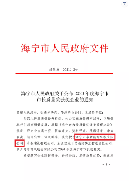 海宁正泰新能源获“2020年度海宁市市长质量奖”