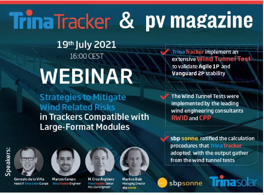 在本次与PV Magazine联合的举办“如何确保跟踪支架在极端天气条件下的稳定性”网络研讨会上,独立权威的第三方技术顾问公司SBP总经理Markus Balz,天合光能多位专家包括天合跟踪高级土木工程师Cruz Argüeso Chamorro,天合跟踪工程师Marcos Cerezo和天合光能欧洲区负责人Gonzalo de la Viña一起讨论了风洞测试中使用的不同模型、进行全气动弹性模型测试的重要性,并介绍了天合跟踪旨在降低跟踪支架上风相关风险的优化设计解决方案。根据全面的风洞测试结果,天合跟踪提供的优化设计包括两个方面:一是强化结构;二是针对1P和2P配置制定了不同的保护策略。天合跟踪基于权威的风洞测试数据,优化升级了产品设计,进一步提升了支架系统的结构稳定性与适配高功率组件的可靠性。