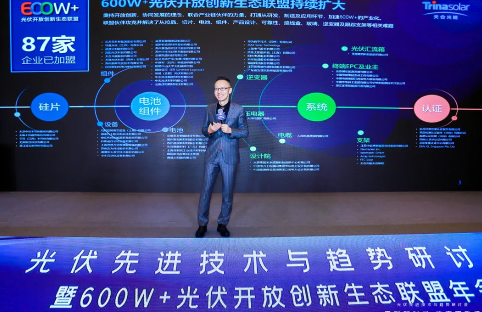 210超高功率组件的量产,成为新赛道的发令枪声。600W+光伏开放创新生态联盟成立一年来,家族成员已从最初的39家成员企业发展壮大为87家,包含电池、组件、逆变器、支架、线缆、背板、玻璃、设计院、EPC、检测认证等全产业链。