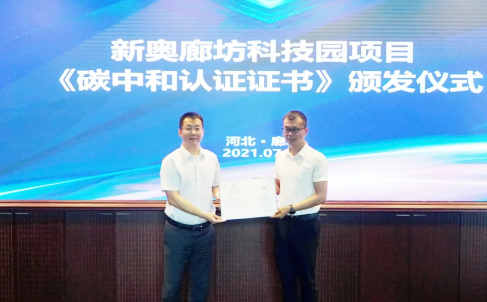 7月23日,新奥廊坊科技园《碳中和认证证书》颁发仪式顺利举行。来自新奥廊坊科技园、中国船级社、新奥数能等代表出席会议,浙江省机关事务管理局行政中心管理处领导也莅临仪式现场。在多方见证下,中国船级社向新奥廊坊科技园正式颁发《碳中和认证证书》。