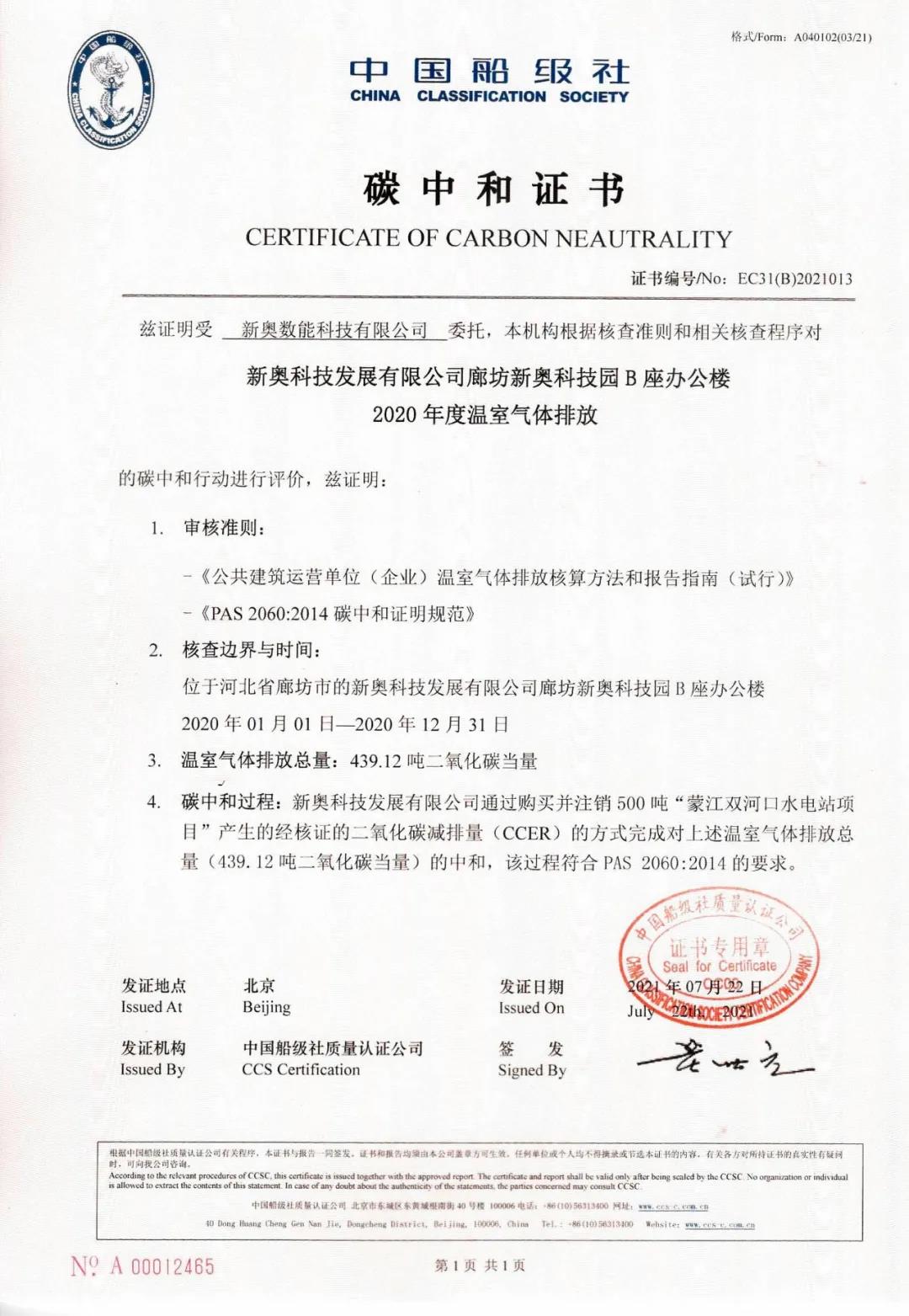 廊坊新奥科技园委托泛能网对园区内新奥科技B楼2020年度温室气体排放情况进行核查。核查报告显示,2020年01月01日—2020年12月31日温室气体排放总量为439.12吨二氧化碳当量,通过购买自愿减排指标(CCER)进行排放抵消,完成碳中和。
