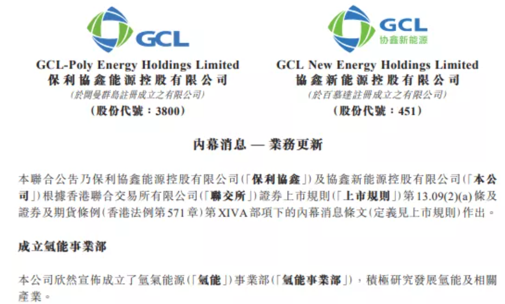 北极星氢能网还注意到,在这份公告中,协鑫新能源还提到已与该公司之关连人士保利协鑫天然气集团订立谅解备忘录,将布局天然气制氢。