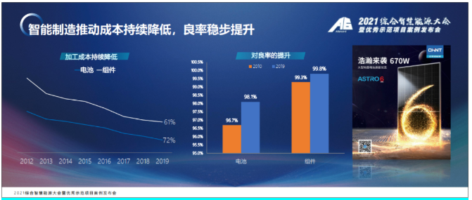 设备自动化、数据信息化、运营智能化、平台协同化是智能制造发展的四个阶段。在大数据时代和数字化转型大背景下,正泰顺应时代浪潮积极探索,目前在组件制造和电站运维已经达到大部分智能化,正逐步迈向供应链协同和不同产区协同的大数据基础时代。通过智能制造正泰加工成本持续降低,良率稳步提升。
