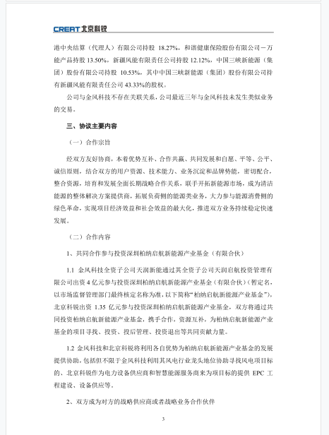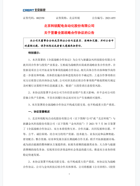 7月30日,北京科锐公告:北京科锐和新疆金风科技将培育和发展全面长期战略合作关系,联手开拓新能源市场,成为清洁能源的整体解决方案提供商,拓展负荷侧的能源类业务。合作内容包括:共同合作参与投资深圳柏纳启航新能源产业基金(有限合伙);双方成为对方的战略供应商或者战略业务合作伙伴;共同出资注册成立金风科锐新能源投资有限公司。具体公告如下: