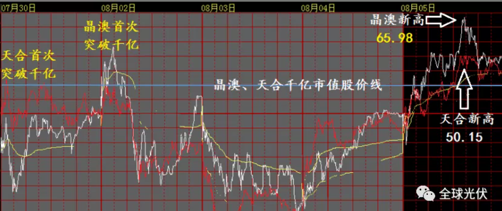 “晶、天”之战,你以为只是市场行为,实际上盘面中无时无刻不体现了“你追我赶”,似乎总是有一双看不见的手在左右博弈。8月5日,“晶、天”之战振奋人心,晶澳、天合携手迈进“千亿市值”光伏军团。