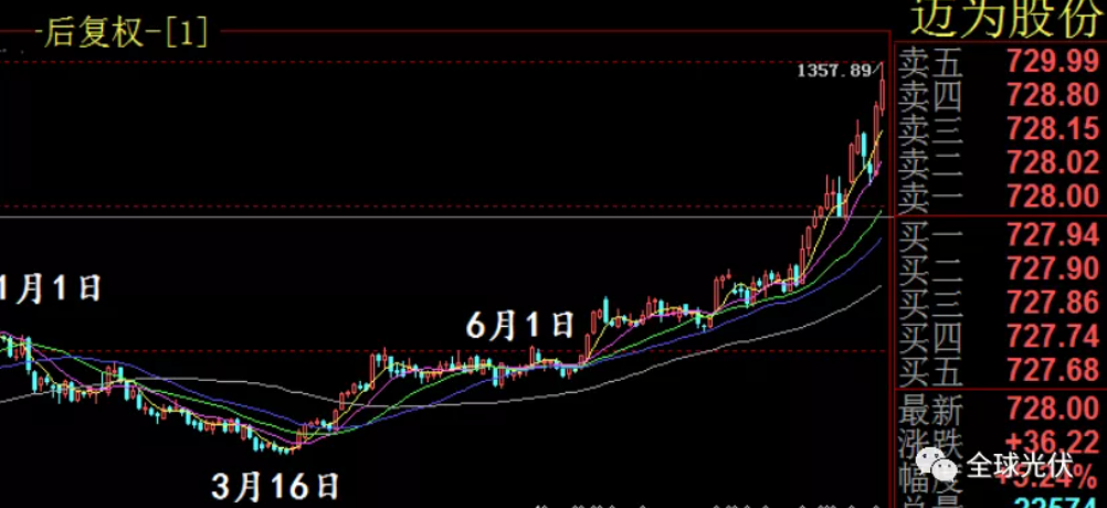 同样表现强劲的异质结概念股是迈为股份。自今年3月股价阶段性新低371.11元后,以后复权计算,今日股价最高点为1357.89元(标准除权为727.94元),上涨265%!若以去年年底收盘价677.01元计算,本年度已上涨100.5%!