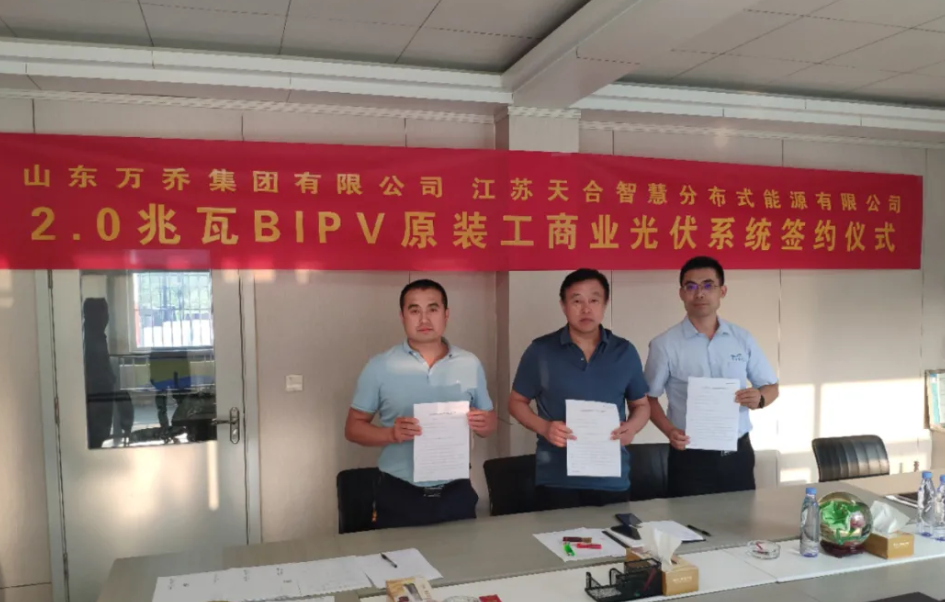 8月7日,天合蓝天与山东博山万乔集团合作的BIPV“天能瓦”项目正式签约。此次合作将由天合蓝天对万乔集团进行老旧彩钢瓦屋顶进行更换改造,为其盖新“瓦”,换新衣,助力万乔集团能源转型,打造可持续发展绿色企业能力。