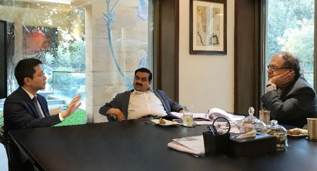 中信博营销中心负责人容岗(图左)与Adani集团创始人、董事长Gautam Adani(图中)及Adani CEO Jayant Parimal(图右)探讨合作方案