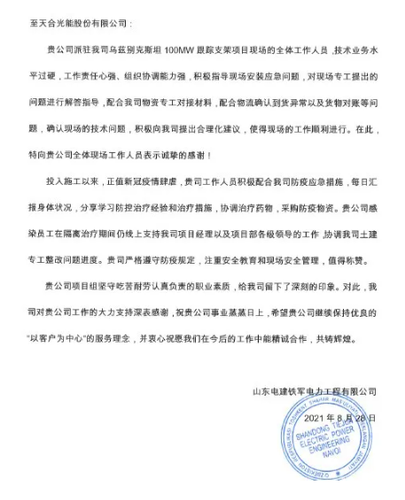 最近,天合跟踪项目团队收到了来自电建三的感谢信,信中对于天合跟踪团队在疫情防控期间在整个项目的交付实施过程中体现的专业能力、尽职尽责的态度和过硬的项目管理能力给与了高度评价,特别是在疫情防控的情况下,天合工作人员克服各种困难积极支持项目管理的工作,充分体现了天合‘以客户为中心’的核心价值观。