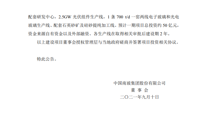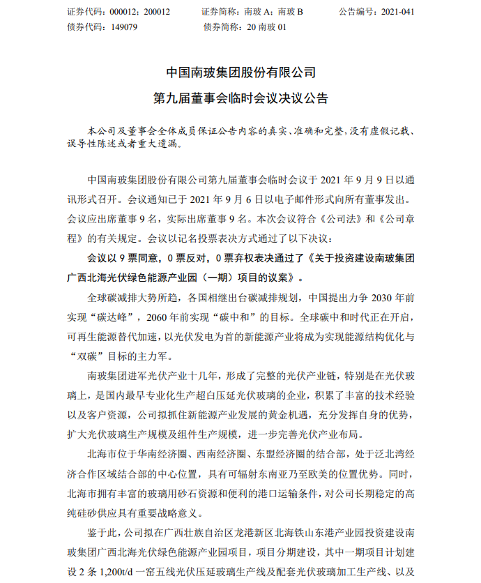 9月10日,南玻A发布第九届董事会临时会议决议公告。公司表决通过了《关于投资建设南玻集团广西北海光伏绿色能源产业园(一期)项目的议案》。