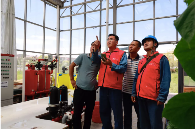 ▲国网宁夏电力员工帮助村民使用“智慧大棚”电力设备