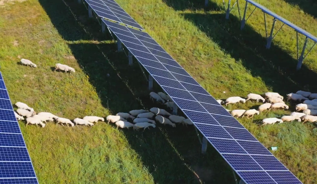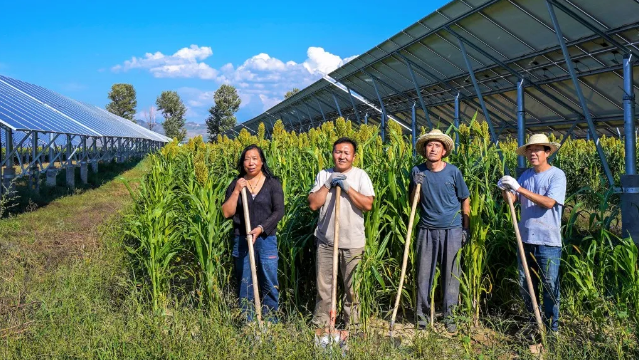 这片高粱地主要被当地种植大户承包,43岁的杨伟是当地的农场主之一,主要从事农业种植、牧业养殖。“我去年养了50多只羊,今年承包了100亩地种高粱,高粱销路广泛,可以酿酒、制醋、制作高粱面、高粱粥等。”杨伟告诉我们,“电站桩基间距合理,方便我们放牧种植。这种农光互补的模式既生态环保又不浪费土地,还能增加经济收入!”