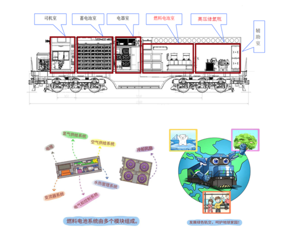氢能作为绿色、高效、可持续的新能源,被视为21世纪最具发展潜力的清洁能源。氢燃料电池作为氢能利用的主要载体,具有能量转换率高、环境污染小、噪音低等优点,在汽车、轨道交通、船舶、航空航天等交通领域具有广泛的应用前景。这次研制的氢燃料电池机车,是世界上首台兆瓦级新能源(氢燃料电池和锂电池混合)供电、永磁同步电机牵引的C0-C0型调车机车。设计时速100公里,起动牵引力520kN,平直道最大牵引载重超过8000吨;并装用12瓶组、35MPa大容量高压储氢罐,满载氢气可连续运行24小时,全过程零排放,完全能够取代80%既有内燃调车机车,可用于在役内燃机车的升级再制造。