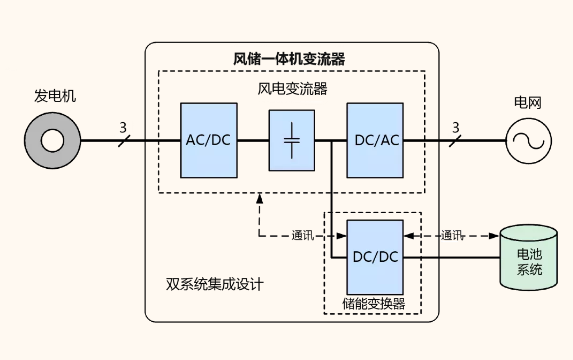 市场上常用的交流侧方案储能系统属于并网设备,需要满足各种电网标准,其调测认证工作繁琐,周期较长。而风储一体变流器采用直流侧储能方案,储能系统未直连电网,无需考虑涉网规格和并网标准,减少认证调试工作,缩短项目建设周期,加快场站并网运行。