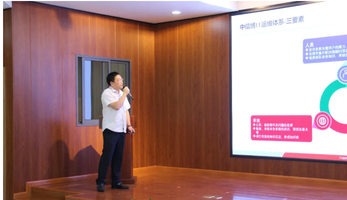 大会上,中信博信息中心总监、SAP项目经理吴伟宏还对项目保障措施做了详细的介绍,以稳定系统、支持变化、培养能力三方面为保障运维的目标,在运维过程中以人、制度、系统三要素相结合,充分发挥关键用户与IT内部顾问的能力,建设合理的制度运维体系,并通过对SAP系统业务流程数据的分析与监控,对SAP业务流程持续的僵化、优化与固化,为中信博数字化转型垫定坚实的基础。