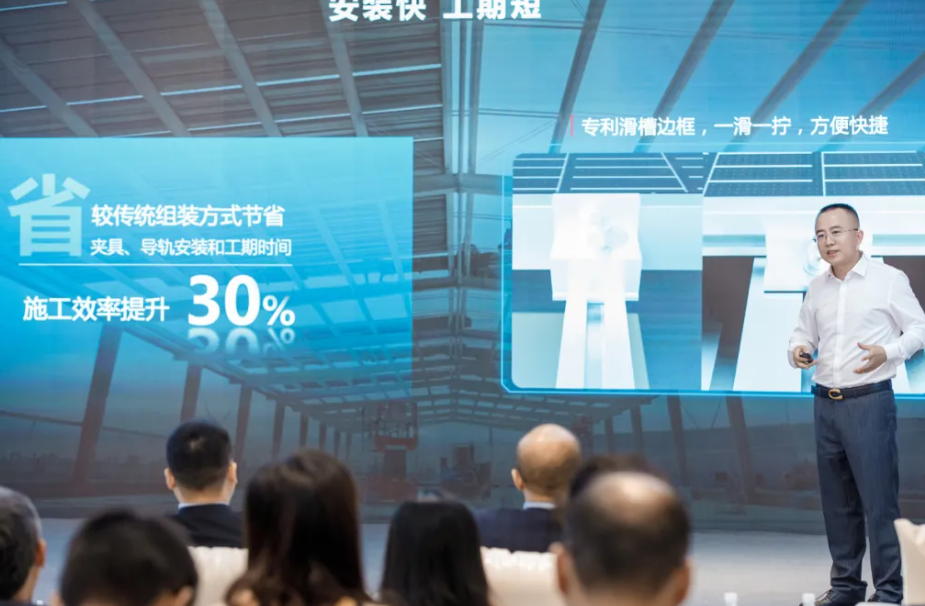 不只如此,作为国内光电建筑应用行业的知名专家,中国建筑金属结构协会光电建筑应用委员会总工郑金峰长期聚焦研究光电建筑领域,曾参与推进多项重大光电建筑行业标准和规范制定,对于“天能瓦”,郑金峰也在现场坦言,天合蓝天·天能瓦是一个伟大的光伏屋顶结构形式的革新,在企业屋面上做光伏是一个体系,包括安全、效率、质量、寿命、成本等各个方面,天合蓝天“天能瓦”采用的一体成型彩钢瓦采用锌铝镁、抗电化学材质,具有耐腐蚀、高强度等优良特性,并且与传统胶粘方式比起来,板材间无缝衔接,从源头解决漏水困扰。从整体来看,天能瓦将安全与效率等各方面紧密结合,让整个发电系统可靠无忧,是企业优选绿色屋顶。也祝愿天合光能可以一如既往地坚持创新精神,更进一步完善,让天能瓦更上一层楼。