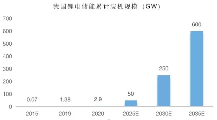 据《中国锂电储能发展战略展望》测算,预计到2025年,我国锂电储能累计装机规模将达到50GW,市场空间约2000亿元;而到2035年,锂电储能累计装机规模则有望达到600GW,市场空间约2万亿。