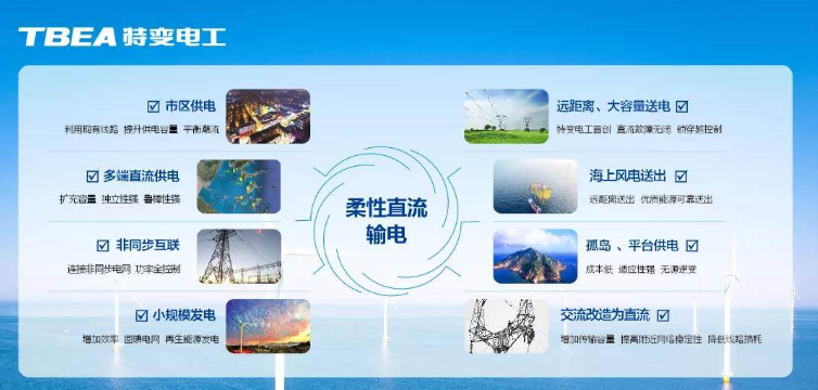 在海上风电柔直外送应用场景,特变电工提出了针对远海风电柔直外送系统解决方案,包括1GW、2GW整装输出系统方案,和以往工程比较,换流阀设备占地减小30%左右,减重20%左右,采用柔性直流输电技术,可将海上风电等新能源友好可靠接入电网。