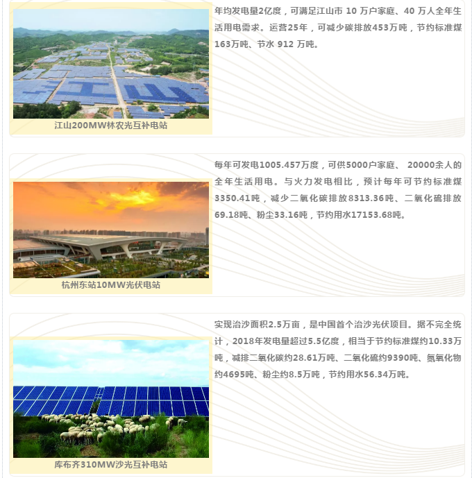 正泰因地制宜建设的数个 “锦绣光伏”项目,皆能产生较好的经济、社会和生态效益,如浙江江山200MW林农光互补电站、杭州东站10MW光伏电站、库布齐310MW沙光互补电站,在荷兰等海外国家的多个光伏项目也都从环保的角度充分考虑到电站和周边景观的协调。