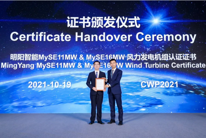 国际认证机构DNV向明阳智能颁发了MySE11和MySE16机型颁发机组认证证书。