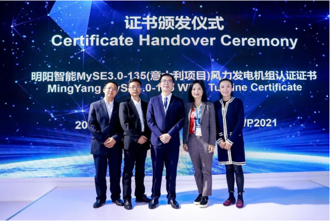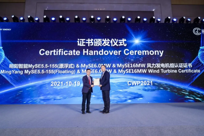 北京鉴衡认证中心向明阳智能颁发了MySE6.0兆瓦机型、MySE16机型和MySE5.5-155漂浮式机型颁发机组认证证书。