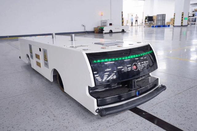 另外,为提高工作效率,减轻工人的负担,在很多环节也加入了智能化,在车间黑色的轨道上穿梭的就是AGV智能搬运机器人,它可以完成物料的定点运送,节省了很大一部分人力;