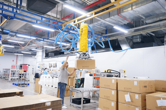 包装车间的无重力吊车和自动化包装线,让一个人就可以搬动上百斤的机器,甚至单手操作,让包装效率更快。