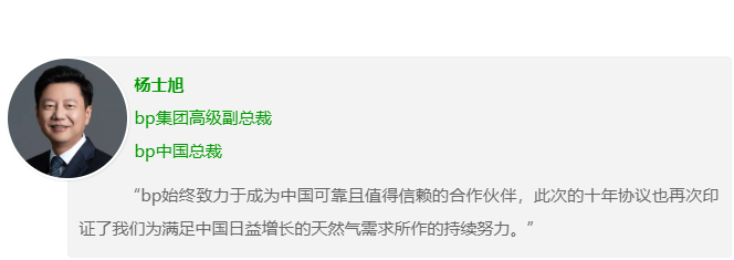 一直以来,bp持续不断加大在华投入,助力中国打造更好、更清洁的未来能源。通过向中国市场提供更多的天然气,满足中国日益增长的清洁能源需求,并与合作伙伴携手为中国的经济发展提供有力支持。