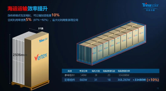 “大功率是可为,有为就是要把我们大功率在应用道路上的各种困难排除掉。”唐正恺在演讲中提到,光伏6.0时代已经来临,天合光能210超高功率至尊组件创新的组件技术和产品设计在进一步提升组件效率和性能同时带来了更低的系统成本,适配更多应用场景,即使是山地,不规则用地等复杂地形也能灵活布置,210高功率组件在减少每一个组串长度的同时不会降低每一个逆变器的容配比,确保整体的性价比优势,这是传统的166以及现在182所不具备的。在物流方面,海运运输中天合至尊660W采用的立式包装可以增加10%装载量,国内平板车运输效率提升24%,每50MW总货箱数量相比182-540W组件减少543箱,减少二次倒运及卸货成本。