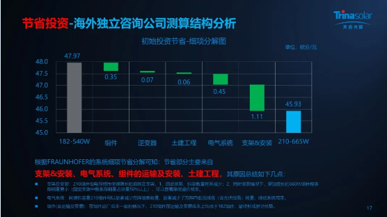 通过海外独立咨询公司Fraunhofer ISE,ENERTIS,DNV GL的测算结果,均证明了天合210-660W至尊组件在节省投资方面的优势。根据权威机构Fraunhofer ISE的细项拆解,节省部分主要来自支架&安装、电气系统、组件的运输及安装、土建工程。210组件低电压特性使得其有更长的组串及支架,从而减少桩基、斜梁数量、檩条用钢量;同时,显著减少方阵组串数量,减少了方阵内低压线缆(含光伏线缆)的用量;在组件出厂成本一致的情况下, 210组件在运输及安装成本上均优于182组件,最终形成累计优势。在全面平价时代,先进210至尊系列组件的度电成本优势更为突显。