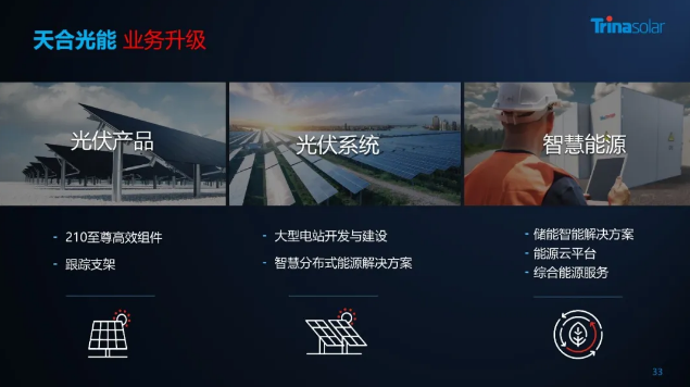 3060双碳目标的设定奏响了新能源发展的新篇章,光伏迎来了快速发展机遇,将逐渐成为未来中国重要的电源之一。而大尺寸、高功率的光伏组件也带来了更低的成本和更高的收益。天合光能在光伏产品,光伏系统,智慧能源都进行了充分的布局。未来,天合光能将不断推动光伏行业发展,让绿色能源走进千家万户,为构建无碳的新能源世界筑牢坚实基座。