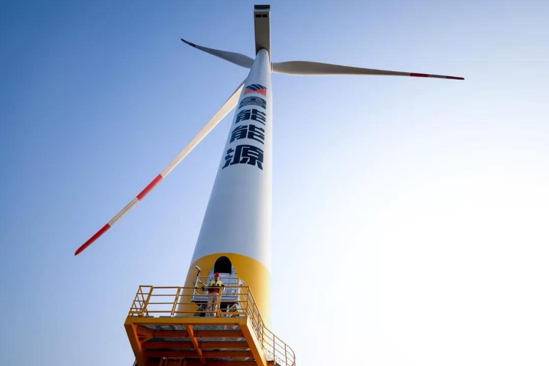 △鲁能江苏东台海上风电项目风机共50台,高90米。风机建成后,裴波站在风机塔筒外平台远眺风场。