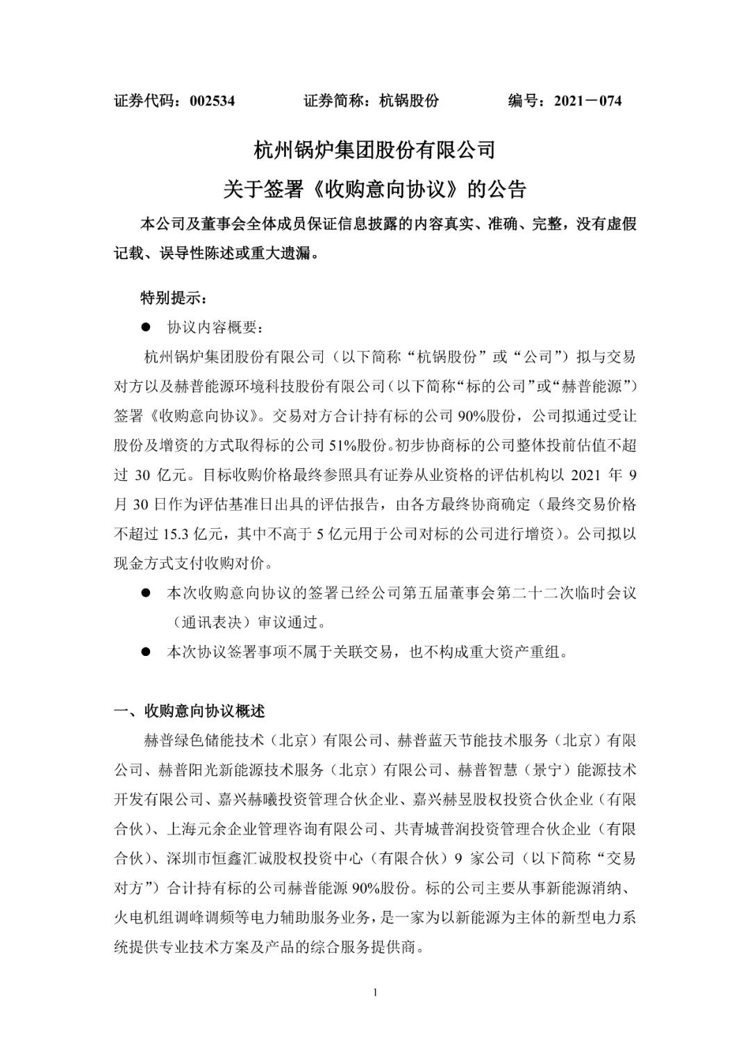 11月7日,杭锅股份发布公告,公司拟与交易对方以及赫普能源环境科技股份有限公司(简称“标的公司”或“赫普能源”)签署《收购意向协议》。交易对方合计持有标的公司90%股份,公司拟通过受让股份及增资的方式取得标的公司51%股份。初步协商标的公司整体投前估值不超过30亿元。目标收购价格最终参照具有证券从业资格的评估机构以2021年9月30日作为评估基准日出具的评估报告,由各方最终协商确定(最终交易价格不超过15.3亿元,其中不高于5亿元用于公司对标的公司进行增资)。公司拟以现金方式支付收购对价。