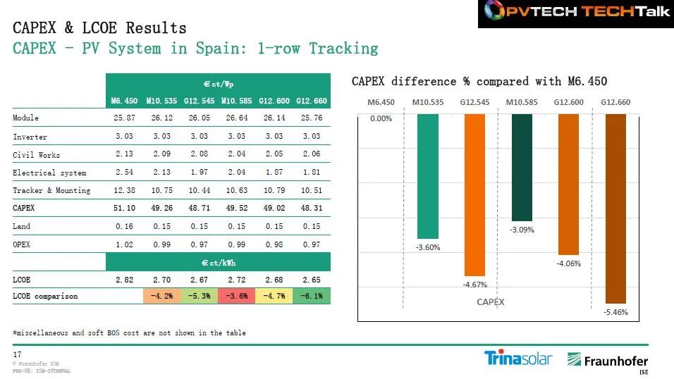 《白皮书》列举了多个第三方机构针对210至尊系列组件搭配跟踪支架做的价值测算。Fraunhofer ISE测算分析中,在项目地位于西班牙、系统设计采取单排竖装平单轴(1P)跟踪支架的条件下,210至尊660W、545W组件对比585W 182组件,CAPEX节省可达0.81-1.21€cWp,LCOE节省可达1.8–2.6%;对比450W 166组件,CAPEX节省可达2.39-2.79 €cWp,LCOE节省可达5.3%-6.0%。