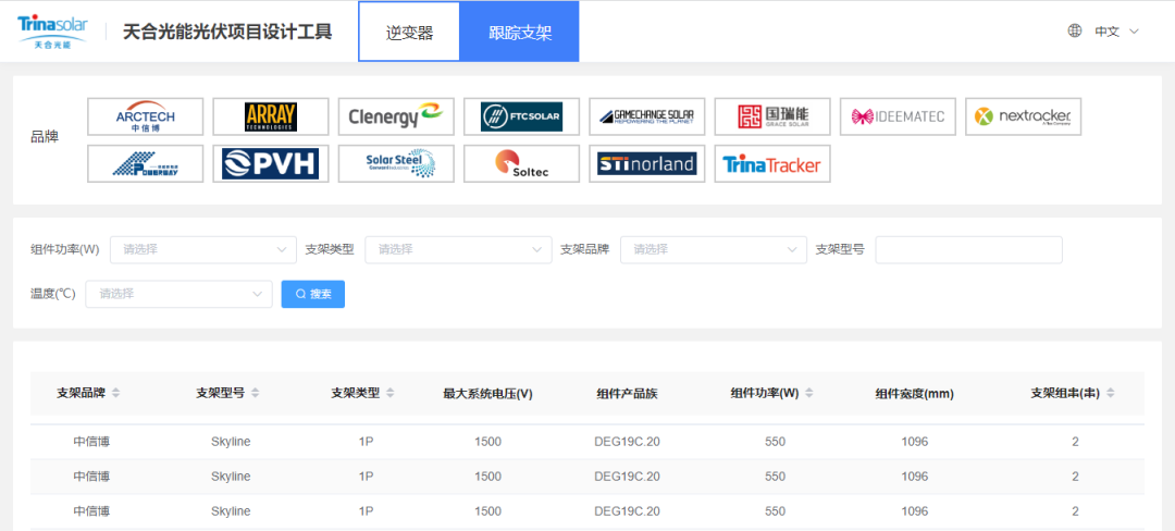 为给客户提供更好的服务,天合光能在此前逆变器智能匹配数据库的基础上,更新并收录了全球14家主流跟踪支架厂家、30余款跟踪支架产品,重磅上线“天合光能光伏项目设计工具”2.0版。(网址:pvd.trinasolar.com)