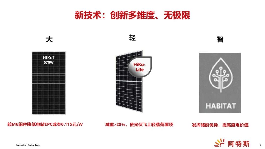 与提升光伏转换效率相伴的是通过技术创新来扩大应用场景和提升用户感受。我把阿特斯这几年所做的这方面的创新总结为:大、轻、智。