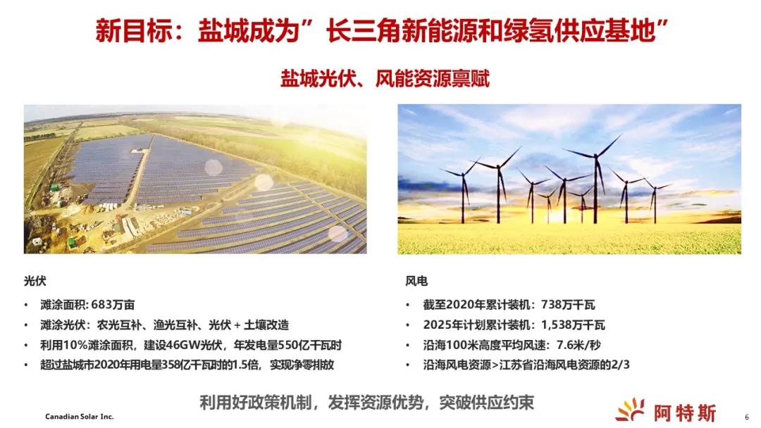 盐城具有发展100GW级光伏和风电的土地和风资源,滩涂面积680万亩,是长三角地区开发可再生能源最重要的资源,利用好这一资源,对长三角、特别是江苏省提前实现碳达峰,加快碳中和进程意义重大。