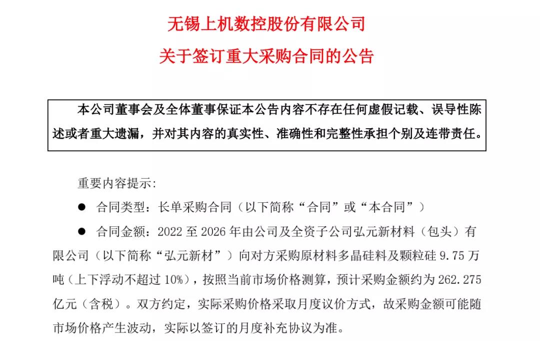 公告称,上机数控在2022年至2026年由公司及全资子公司弘元新材料(包头)有限公司(以下简称“弘元新材”)向江苏中能硅业科技发展有限公司(以下简称“江苏中能”)采购原材料多晶硅料及颗粒硅9.75万吨(上下浮动不超过10%),按照当前市场价格测算,预计采购金额约为262.275亿元(含税)。