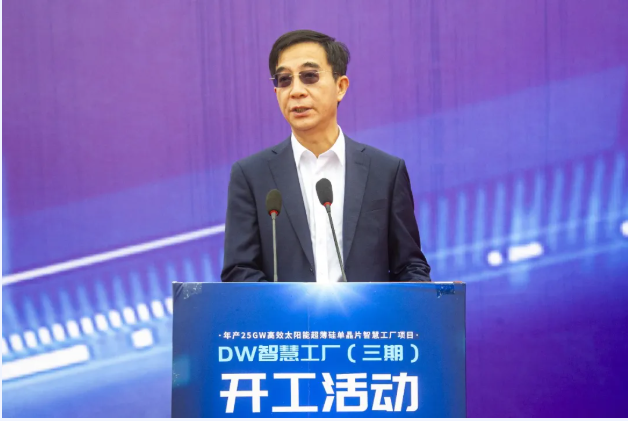 沈浩平在致辞中首先对各位嘉宾的到来表示热烈欢迎,中环半导体正在天津建设当前全球最大的 G12 单晶硅片智慧化生产基地。今日开工的DW 智慧工厂(三期)项目拟投资30亿元,该项目将继续发挥中环半导体 G12 产品技术优势及工业4.0智慧化设计理念,进一步提升柔性化制造能力。