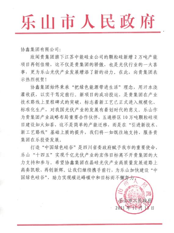 协鑫投资乐山,依托乐山水电消纳示范区的电价洼地优势,导入全绿色、零污染、低能耗的生产运营工艺体系,打造国际一流、行业领先、安全高效的绿色标杆项目,可为乐山建设成为“中国绿色硅谷”提供强劲动力。乐山市政府在贺信中表示,将一如既往地支持、服务协鑫集团在乐山投资发展。