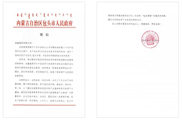 包头市政府在贺信中表示,当前包头正以“建设全国重要的新型材料产业基地和现代能源产业基地,建设在全国有重要影响力的现代装备制造产业基地”为抓手,全力打造一流营商环境。包头市政府将持续为协鑫集团提供全方位、全过程的“包你满意”服务和保障,携手共创新能源产业发展的美好未来。