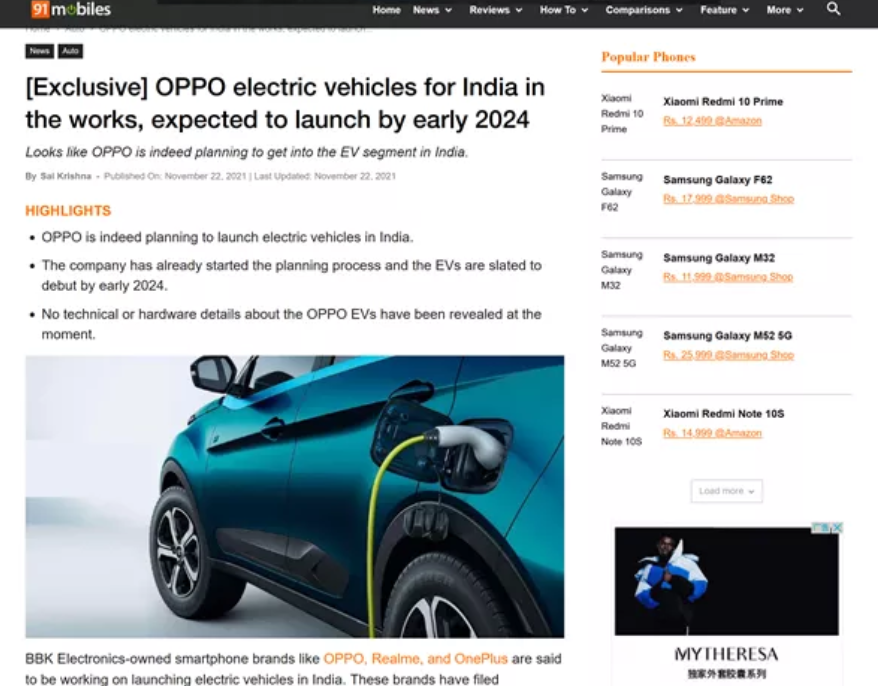 据91mobiles报道,OPPO将在印度市场推出纯电动汽车,并且已经开始规划详细进程,预计首款车型将于2023年底或者2024年初发布。