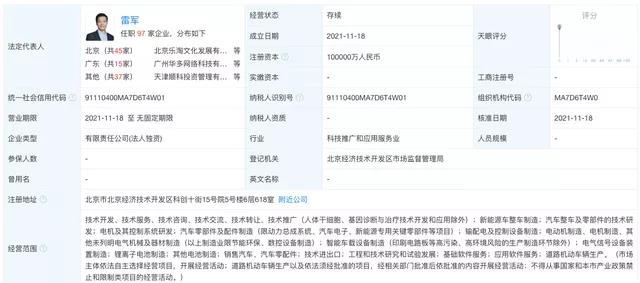 天眼查显示,11月18日,小米汽车科技有限公司成立,法定代表人雷军,注册资本10亿人民币。经营范围含新能源车整车制造;汽车整车及零部件的技术研发;智能车载设备制造;锂离子电池制造等。