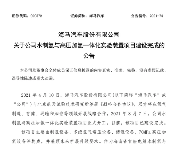 2021 年 4 月 10 日,海马汽车股份有限公司(以下简称“海马汽车”或“公司”)与北京航天试验技术研究所签署《战略合作协议》,双方将在氢气制造、存储、运输和加注等领域开展战略合作。2021 年 8 月 7 日,公司水制氢与高压加氢一体化实验装置项目正式开工。目前,该项目已建设完成。