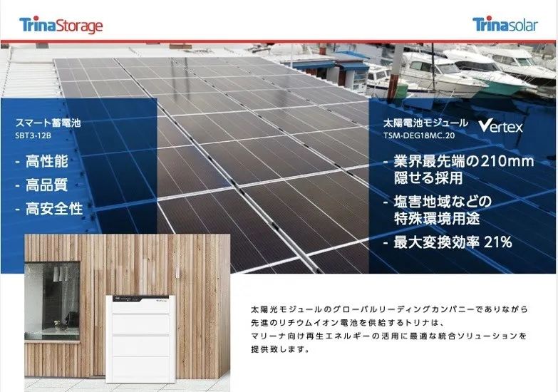 作为全球领先的光伏智慧能源整体解决方案提供商,天合光能为日本市场定制开发的分布式光储解决方案采用了最新Vertex至尊组件及自研分布式储能系统,系统性能领先。Vertex至尊组件在船舶、游艇、屋顶等特殊应用场景已获得日本市场客户充分肯定和广泛认可,确保高发电量同时,“双玻”创新设计有效避免海水的腐蚀和影响,实现可靠性双重保障。2020年7月28日,天合光能自主研发的分布式储能电池系统通过苛刻验证及测试、获得日本最权威机构Japan Electrical Safety & Environment Technology Laboratories(JET)认证证书,成为首家荣获日本JET认证、登录日本政府补贴目录的中国品牌储能电池系统。