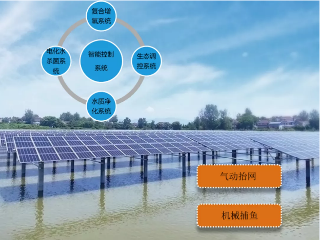 在进行光伏系统设计前对每个鱼塘塘底、塘堰进行清理整治,并增设投饲捕捞区域、捕捞环沟、进排水闸、起鱼平台及踏步等基础设施。根据渔业养殖需求增加智能化渔业设施(包括智能控制系统、复合增氧系统、电化水杀菌系统、生态调控系统、水质净化系统等),全部采用太阳能绿色电力供电。遇到阴雨天或天气突变,通过智能控制系统及时开启复合增氧系统增强水体的对流与交换。当各类水产品进入生长的黄金时期,排泄物显著增多时,及时开启电化水杀菌系统、生态调控系统及水质净化系统,改善水质环境。同时配套气动抬网、机械捕鱼等现代化渔业机械,在水面上自由移动网具捕捞,捕捞面积大,捕捞效果好,不伤鱼体,配合囤鱼网箱,可以随意捕捞随时运输,达到高效捕捞目的。通过鱼塘的专项设计改造、现代化渔业设施、智能化管控系统的综合设计实施,便捷渔业养殖的同时,进一步通过科学管理理念,实现渔业智慧养殖。