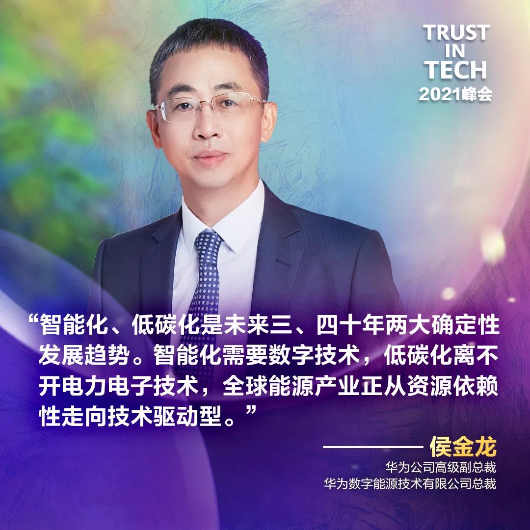 12月2日,在华为科技信任峰会(TrustInTech Summit)上,华为公司高级副总裁、华为数字能源技术有限公司总裁侯金龙发表了“技术创新,共建低碳智能社会”的主题演讲。他表示,智能化、低碳化是未来三、四十年的两大确定性发展趋势。智能化需要数字技术,低碳化离不开电力电子技术,全球能源产业正从资源依赖性走向技术驱动型。